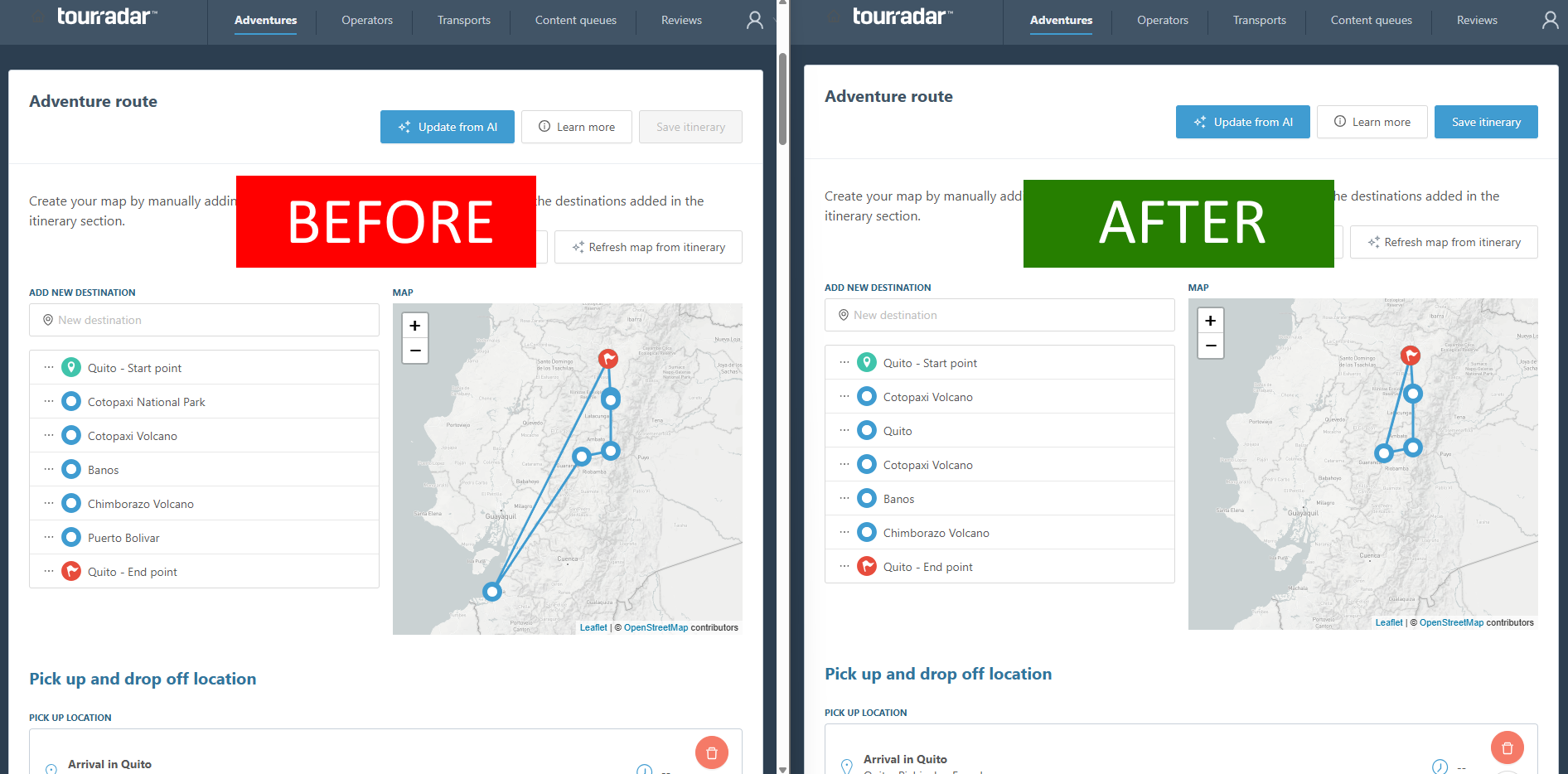 Phase 1 & 2 cleaned our history; Phase 3 simplifies the future. We overhauled the operator dashboard to make location management a faster, more intuitive experience, moving from a clunky two-step process to a single, streamlined UI with fewer buttons. The map is now permanently visible, providing real-time visual feedback during edits. We've replaced general "Tour Locations" with required Day Locations to ensure maximum itinerary accuracy, and added new transit mode options for River Cruise and Sailing days so operators can mark days as Transit without requiring a specific map pin.