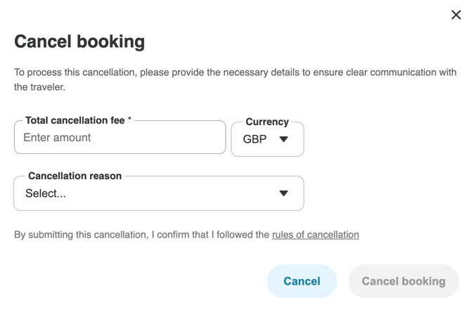 Once you click Cancel Booking, the system will automatically cancel the booking. If the traveler has paid more than the cancellation fee, our team will issue the refund.