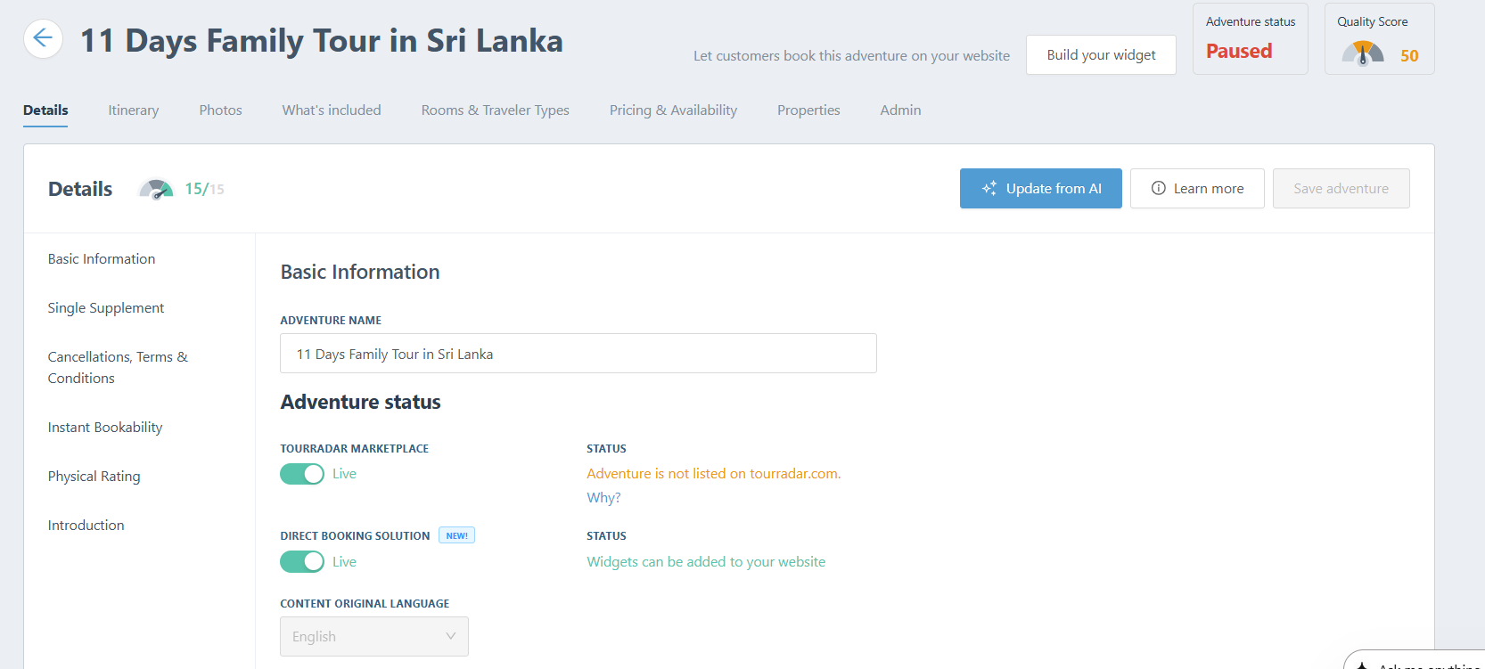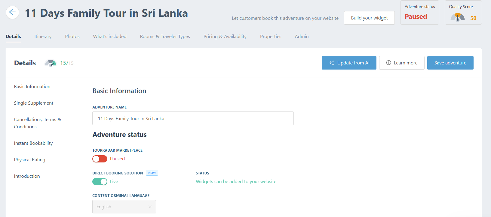 - Change 'Adventure Status' on the Tour Details tab.